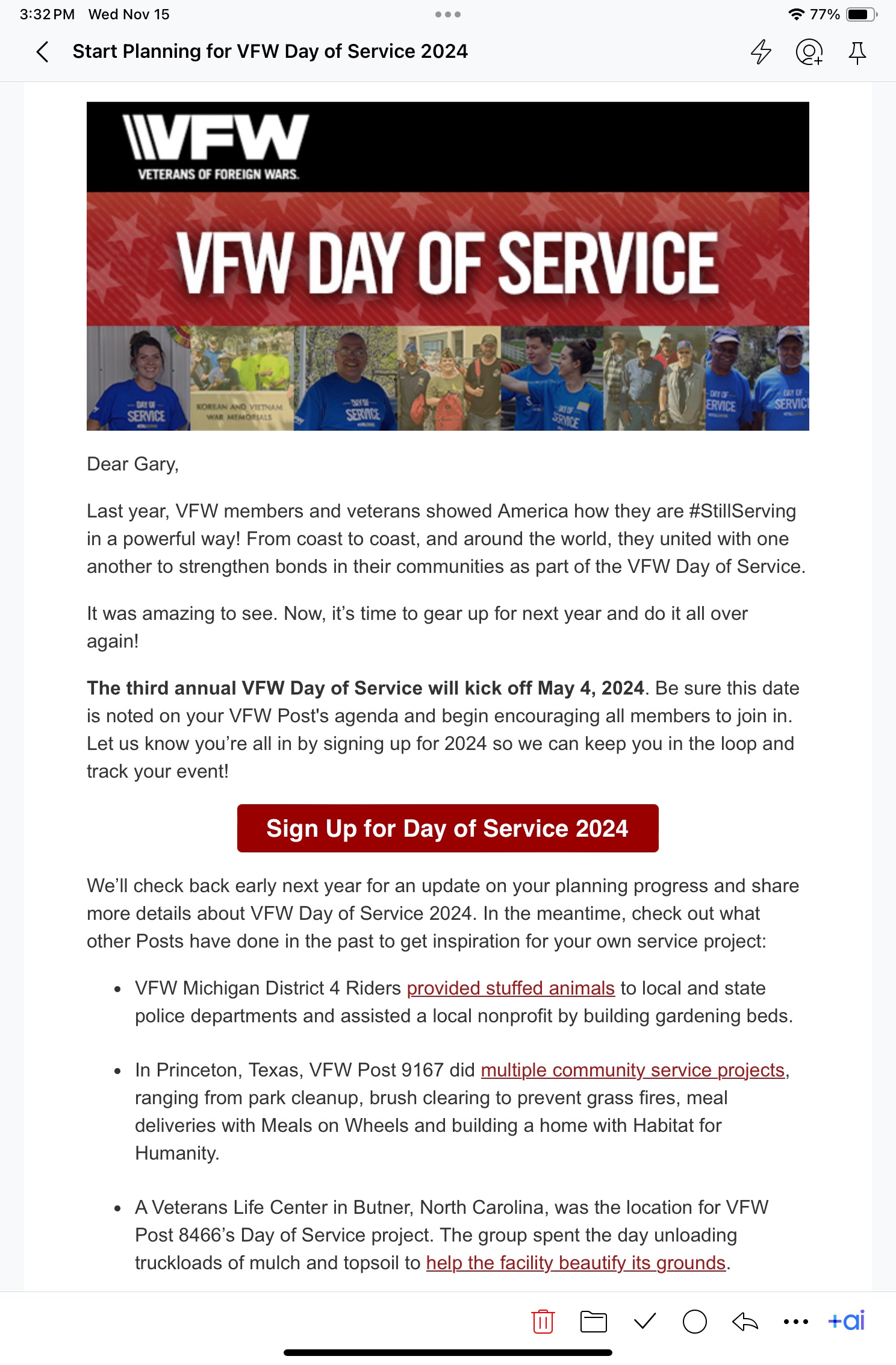 Be sure to check out the photo attached to his post. This photo was a national email sent out by the National VFW Headquarters. It's a great reminder of the amazing work we accomplished during the 2024 VFW Day of Service event and our current project. We should all feel proud of D4 Riders' recognition for our Stuffed Animal Program and the Day of Service project, where we built beds in Hamtramck.